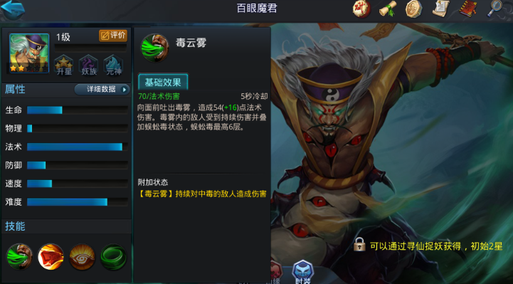 百眼魔君的一技能毒云雾是核心输出手段,需通过天赋见血封喉将蜈蚣毒叠加速度提高20%,快速达到6层上限以触发二技能火毒符的2倍伤害。天赋火毒入体进一步削弱目标法术防御,配合法无定法的额外物理伤害加成,形成多段伤害组合。大招魔眼金光主要用于控制,可衔接毒雾覆盖,但无需优先强化。