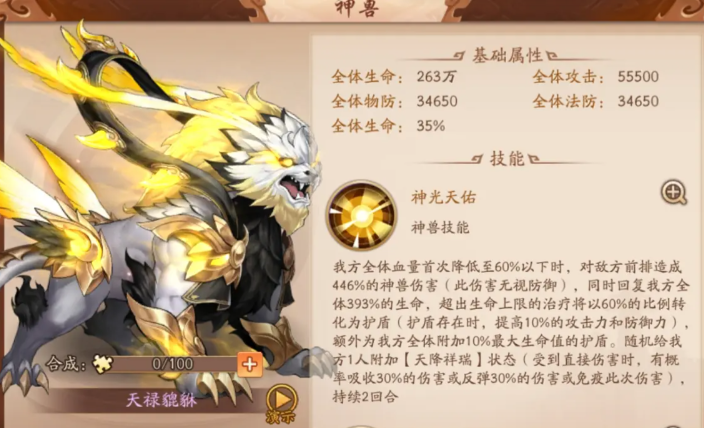 对于追求高爆发的玩家,穷奇和撼地灵犀是不错的选择。穷奇的特点是开场触发减怒效果,能有效压制敌方先手,而撼地灵犀则能在第一回合结束时对敌方前排造成高额伤害并附加眩晕,适合快速建立优势。这两种神兽在PVP中表现尤为突出,尤其是面对高战力对手时,控场和爆发能力往往能扭转战局。如果你的阵容偏向防守反击,可以搭配机关牛或天禄貔貅,前者能在武将阵亡后反击,后者则提供治疗和护盾,大幅提升生存能力。
