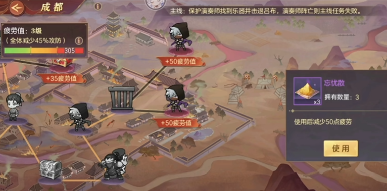 关于阵容搭配,建议主力队伍和备用队伍分开用。主力用来打BOSS和关键战斗,备用队伍可以处理小怪或者完成特定成就。比如第一次进图可以先用强力阵容救人开箱,遇到小怪再换普通阵容去磨,这样能省下主力队伍的体力。道具方面,小还丹救平民后用,大还丹留给武将救援,忘忧散能减疲劳值,合理使用能让你走得更远。想拿全成就的话,可以分几次完成不同目标,比如第一次专注救人,第二次刷全图开箱,第三次专门打吕布。有些成就要求带特定武器或控制疲劳值,提前规划好路线会更高效。