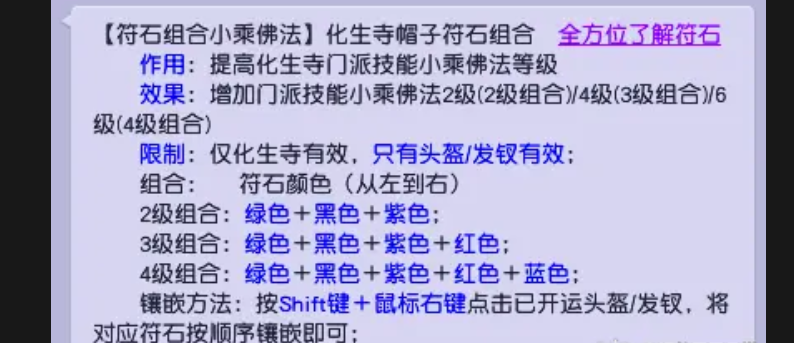 化生寺的符石体系主要围绕提升治疗强度、防御属性及辅助技能等级展开,核心组合包括歧黄之术、大慈大悲、佛光普照等。歧黄之术符石(蓝+黑+黄+红+紫)镶嵌于衣服部位,可提升推气过宫等治疗技能的等级,是化生寺必选的核心组合;大慈大悲符石(白+红+黑+黄+蓝)作用于项链,增强防御属性;佛光普照符石(绿+红+白+黑+紫)则针对腰带部位,强化辅助技能效果。这些组合通过技能等级提升间接增加治疗量、防御或速度,形成化生寺的基础支撑框架。