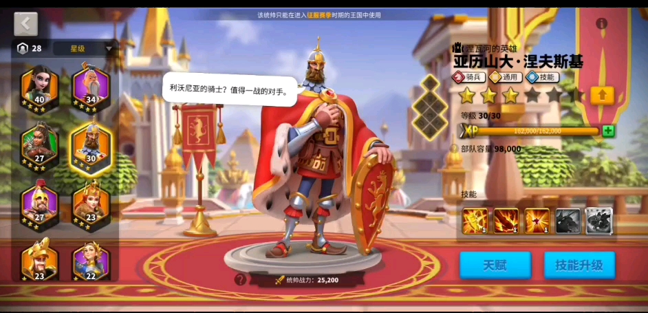 建议优先升级一技能和二技能,这两个是朗纳尔的核心输出手段。四技能虽然重要但不急着升满,前期点到3级就够用了。装备选择上以攻击力和防御力为主,毕竟朗纳尔需要一定的坦度来支撑输出。如果是平民玩家,可以慢慢培养,毕竟朗纳尔不需要特别高的技能等级就能发挥作用。他更适合集结作战和攻城,野战表现会稍逊一筹。使用时要注意兵种搭配,步兵和混兵都是不错的选择。