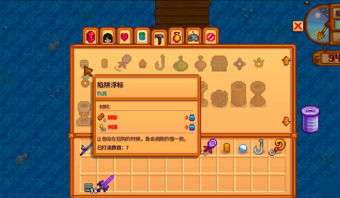 打开背包,左键点击鱼饵或钓具拿起来,再右键点击已装备的鱼竿即可。注意只有玻璃纤维竿和铱金竿能装鱼饵,而钓具仅限铱金竿使用。鱼饵可以用虫肉制作,或者直接在威利的商店购买;钓具则需要通过钓鱼等级解锁配方,比如陷阱浮标能减缓鱼的逃脱速度,适合钓难度较高的鱼。