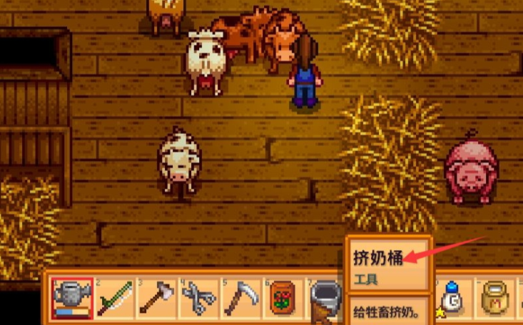 挤奶的方法很简单,拿着挤奶桶靠近奶牛,当它们的屁股对着你的时候点击左键,听到水声就说明挤奶成功啦。如果听到橡皮筋一样的声音,可能是奶牛今天还没产奶或者你的位置没对准。奶牛的幸福度越高,产出的牛奶品质也会更好,所以记得每天摸摸它们,晴天让它们出去吃草,雨天和冬天则要确保饲料槽里有足够的干草。
