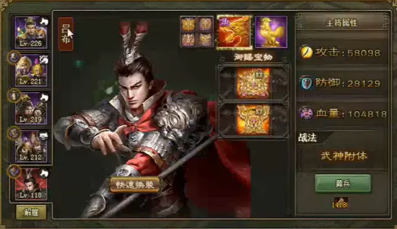 吕布在游戏里属于高爆发型武将,战法战神无双能对多排敌人造成伤害,并且每次击杀都能触发追击效果,暴击率也很可观。觉醒后还能闪避战法伤害,单挑时自动释放战法,阵亡后还能发动赤兔奔袭,妥妥的战场收割机。搭配阵法时,咱们得围绕他的高输出和生存能力来