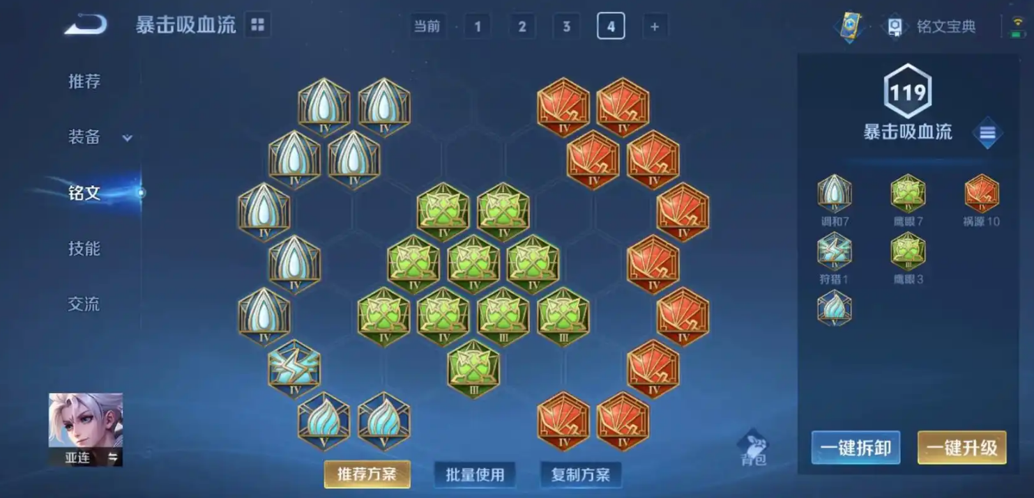铭文搭配对攻速流至关重要,建议采用10x祸源、10x鹰眼、5x狩猎和5x夺萃的组合,这套铭文能显著提升攻速、物理穿透和少量吸血效果。祸源增加暴击率,鹰眼提供物理穿透,狩猎提升移速和攻速,夺萃则增强续航能力,整体让亚连的伤害输出更高效,尤其适合需要频繁普攻衔接技能的战士定位。攻速流铭文需注意平衡属性,避免过度堆叠单一属性导致短板,例如面对控制多的阵容时,可微调配比增加生存铭文,但核心仍是优先攻速和穿透,以发挥亚连混合伤害的优势,最大化前期对线和打野效率。