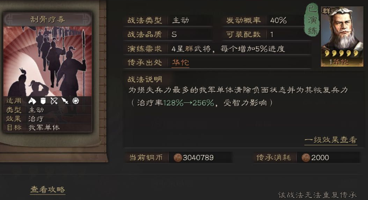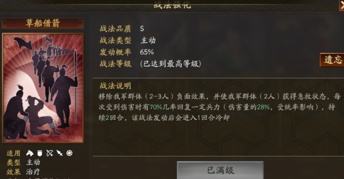 核心治疗战法之一是抚辑军民,它能提供高额免伤效果和回血功能,使用后三回合内有显著减伤,结束后还能恢复队友兵力,这在高端阵容中非常实用,能大幅提升整体强度。新手阶段可能效果一般,因为武将统率值不高会影响免伤发挥,建议等统率提升后再优先考虑这个战法。另一个强力选择是草船借箭,这个战法不仅能解除队友身上的负面状态,比如灼烧或中毒,还能施加急救效果,让受伤队友有高概率自动恢复兵力,特别适合克制依赖负面状态的敌人,但要注意它比较依赖特定武将如诸葛亮才能发挥最大作用。