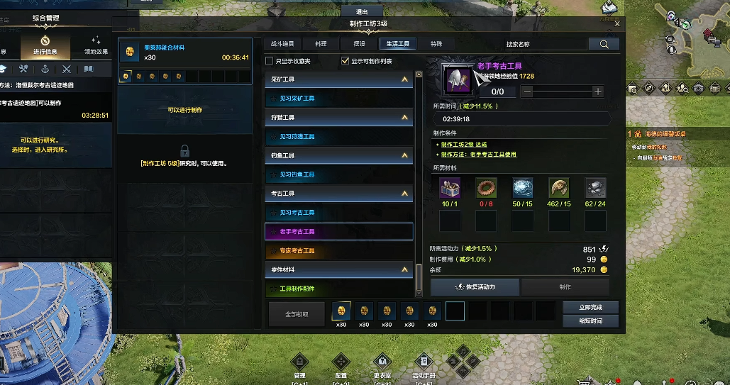 制作生活工具,首先得去领地的NPC那里兑换配方,比如Jennifer会用冒险印章兑换各种工具图纸。学习配方后,就能在领地的制造台制作工具了。紫色、金色和橙色工具会随机生成多条属性,比如增加采集数量或稀有材料掉落率。制作材料主要来自考古获得的遗物,以及采矿、伐木的蓝色和绿色材料,所以平时多积累这些资源很重要。