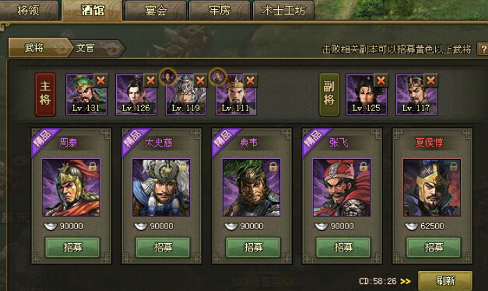 招募副将主要通过点将台或酒馆进行,消耗金币、将魂或招募令等资源,部分稀有副将需通过活动、副本或充值获取,玩家在招募时应优先考虑资源的合理分配,避免过度消耗影响整体发展,招募过程强调效率,通过日常任务和活动积累资源是关键,这有助于快速组建一支多样化的副将队伍。