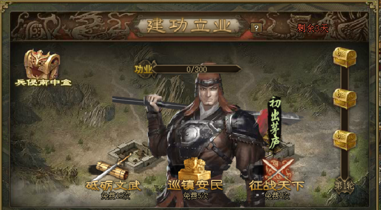 玩转建功立业活动,首先得在游戏活动列表里找到它并点击进入。这个活动是获取兵书和各类物资的好机会,开启后你会看到三个主要的功能按钮:砥砺文武、巡镇安民和征战天下。别急着乱点,先了解清楚每个按钮的作用和资源规划更重要哦,这样才能高效积累功业值,把奖励稳稳拿到手。