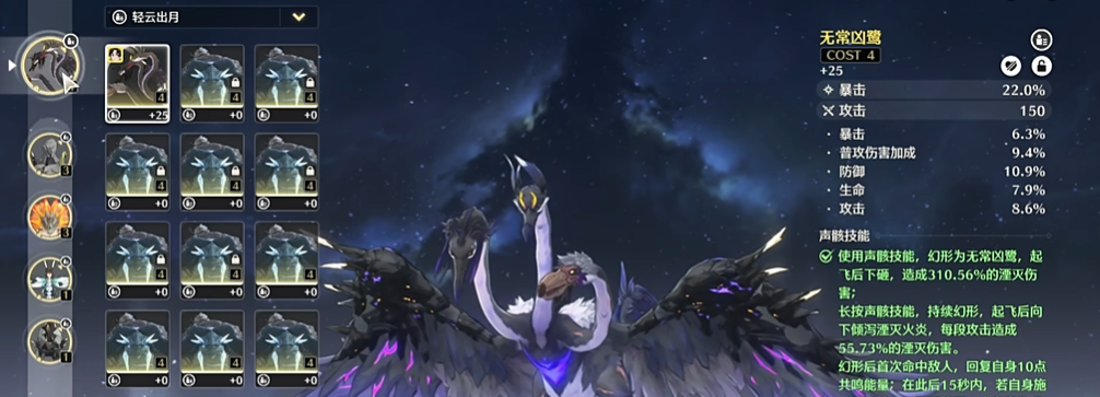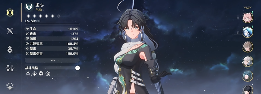 声骸套装的选择取决于你想侧重她的哪方面能力。若希望强化其辅助功能,提升团队输出,轻云出月五件套是最佳选择,能在她使用延奏技能后为队友提供攻击力加成。若想让她承担更多输出职责,则可考虑谷啸长风套装来提升气动伤害。在声骸主词条上,攻击力百分比、共鸣效率和生命值都是有效属性,能同步提升其护盾量、治疗量与伤害。关于配队,鉴心因其百搭的特性而拥有灵活的阵容空间。她可以与任何需要聚怪和生存保障的主C配合,经典的组合包括搭配卡卡罗、忌炎等输出角色,再配以维里奈或白芷这样的治疗位,形成攻守兼备的体系。