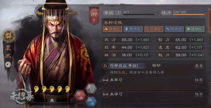 袁术的兵书选择核心在于围绕其自带战法符命自立的爆发期进行设计,以最大化其在前几回合的输出能力。袁术通过玉玺效果能在战斗前两回合获得极高的会心与奇谋概率,并提升主动战法发动率,这决定了他的兵书配置必须服务于速攻与爆发。无论是走纯兵刃、纯谋略还