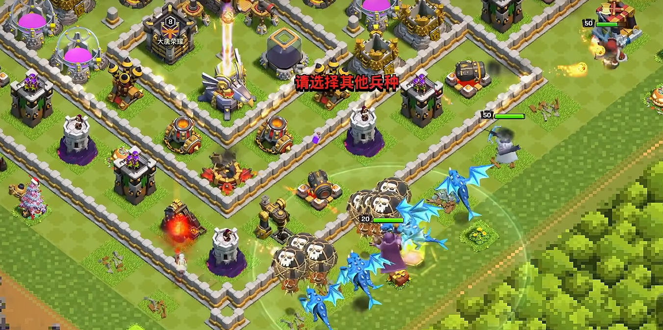 主力通常选择7至8条四级雷龙。法术搭配是重中之重,经典的组合包括4瓶狂暴法术和4瓶冰冻法术,再携带1瓶毒药法术处理援军。也有配置偏向携带3瓶狂暴、1瓶疗伤和3瓶冰冻法术,因为疗伤法术能有效应对多头地狱塔的持续伤害。援军方面,可以请求雷龙与气球的组合或气球加龙宝,以增强清边和后续的进攻能力。狂暴法术能极大提升雷龙的攻击速度与伤害,使其连锁闪电快速摧毁关键防御。