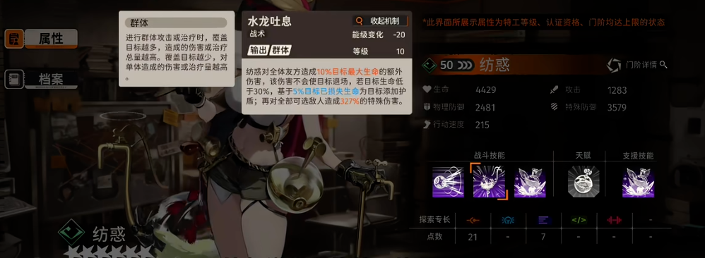 青形定位为DOT体系专属辅助兼承伤位,核心价值是为持续伤害队伍提供独立增伤、减抗与生存补强。战术技能可给敌人附加两层DOT并提升其受到的持续伤害与结算伤害,同名效果可叠加至40%以上易伤,配合楚衣延长效果后,能稳定为DOT队提供高额增伤乘区。超限技能附加DOT与恶氛状态,记录三回合内DOT伤害总量并在结束后结算,4门时恶氛记录比例提升至50%,大幅拉高DOT队爆发上限。天赋可降低敌方效果抵抗,友方挂DOT时自身叠加减伤,最高可达100%,同时快速回复能级,让技能循环更流畅,实战中可稳定站在前排承伤,解决DOT队长期缺前排的痛点。