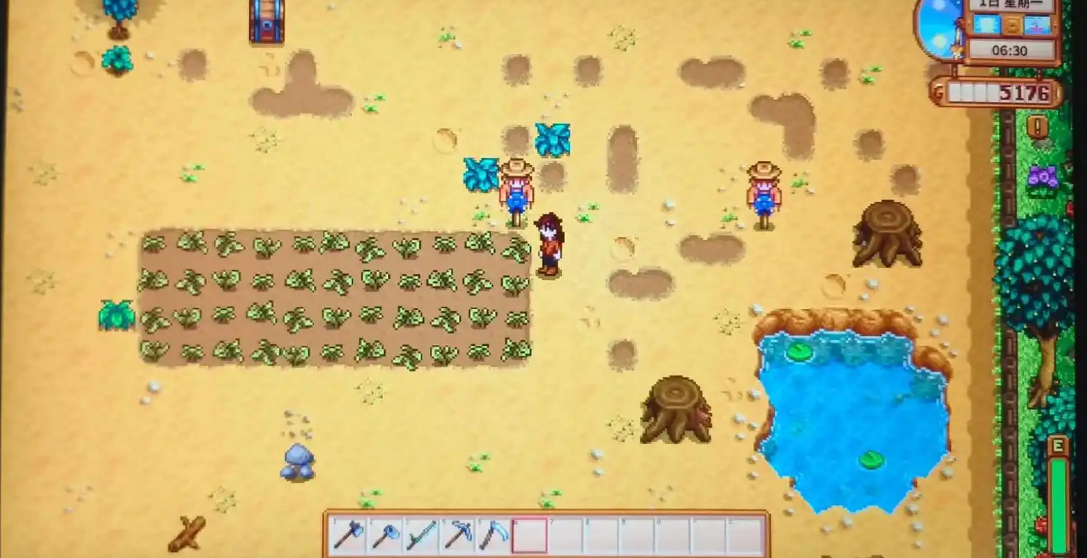 喷壶升级后使用方法也有变化,长按浇水键可以扩大浇水范围。不同等级的喷壶能浇水的次数也不一样,从最初的40次逐渐增加到铱喷壶的100次。浇水范围扩大后真的超级方便,特别是大面积种植的时候,几下就能搞定整片田地。不过升级材料需要提前准备好,尤其是高级喷壶需要的铱锭,得去矿洞深处才能挖到。