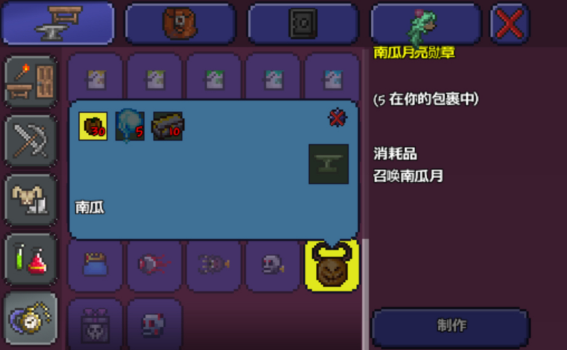 关键得先弄南瓜月勋章,这东西可不是商店里能买到的,需要你自己动手合成。准备好30个南瓜、5份飘忽不定的灵气,再加上10块闪闪发光的神圣锭,找到山铜砧或者秘银砧,就能把它们变成一个南瓜月勋章了。有了它,你直接在晚上使用,无论月亮是圆是缺,整个夜晚立刻会变成南瓜月的狂欢时间,天上的月亮也会变成一个巨大的南瓜灯模样,特别有节日气氛。