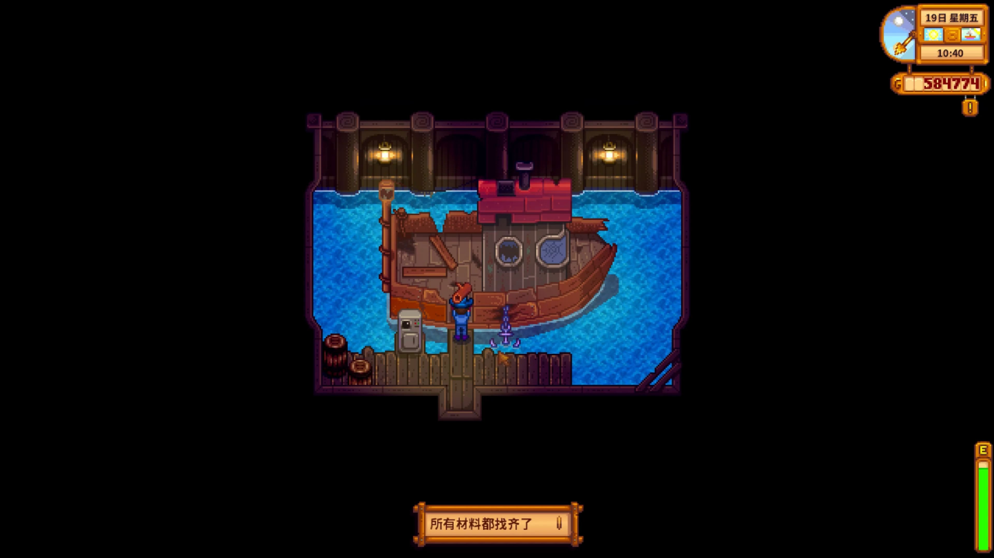 与他对话并提交材料后,断桥会立即修复。修复断桥前需确保已完成社区中心全部献祭或Joja超市的社区发展项目。完成后会收到渔夫威利的信件,提示前往鱼店后门。此处需提交200硬木、5电池组和5铱锭修复船只。