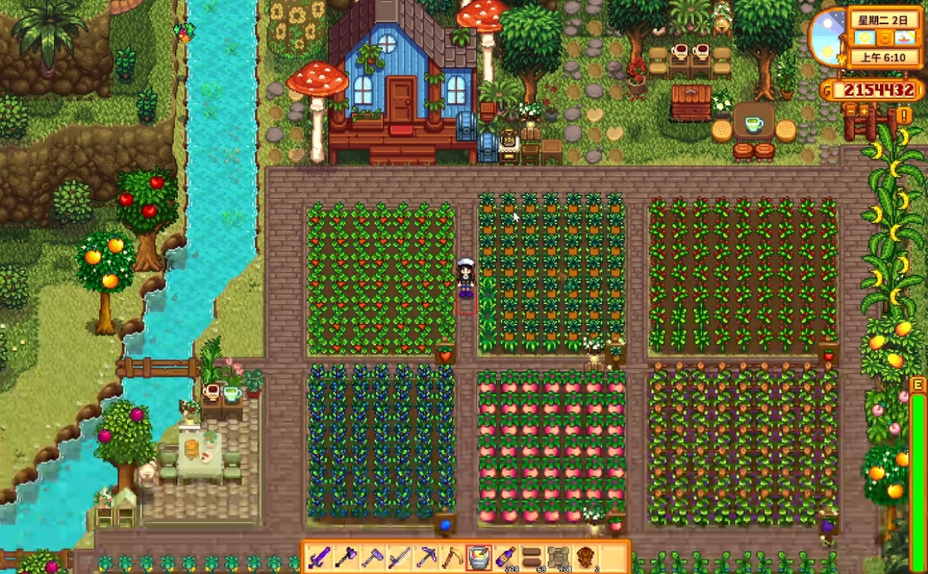 硬木需用升级后的铁斧砍伐大木桩获取,电池组则需通过避雷针在雷雨天气收集。断桥修复后,可通往姜岛新区域,包括特殊农场、采矿点和稀有作物种植区。姜岛农场需规划铱金洒水器布局,推荐种植上古水果或香蕉树以最大化收益。