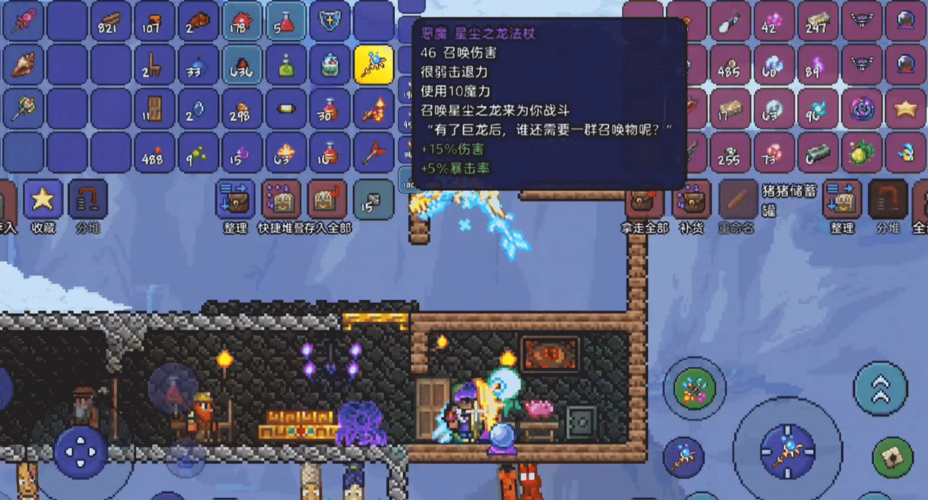 至于制作冰霜龙头杖所需的灵魂材料——光明之魂与黑暗之魂,它们分别产自困难模式下的神圣之地(The Hallow)地下和腐化之地(The Corruption)/猩红之地(The Crimson)地下的敌怪。玩家需要在这些特定的生态环境中击杀敌怪来收集这些灵魂。收集到足够数量的寒霜核、光明之魂和黑暗之魂后,玩家便可以在合适的制作站点进行合成操作,最终获得冰霜龙头杖。