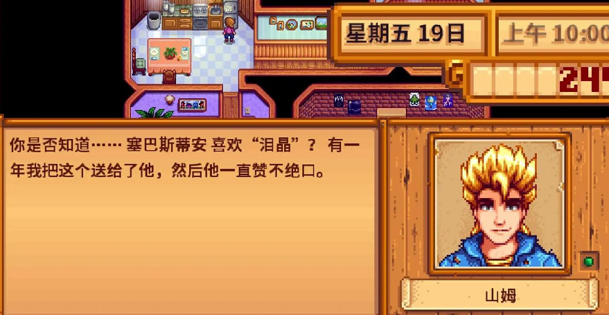 提升好感度的核心方法是了解角色喜好并针对性送礼。以山姆为例,他特别喜爱仙人掌果、枫糖棒、披萨和虎眼石,而海莉则偏好蓝宝石、红盘子等物品。每周最多可赠送两次礼物,生日当天赠送最爱礼物能大幅提升好感。避免赠送角色讨厌的物品,如煤炭或野生山葵,否则会降低好感度。