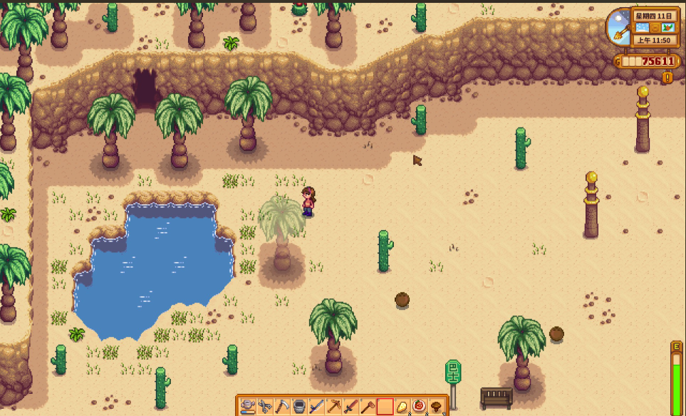 探索沙漠时需注意时间管理和资源分配。建议选择运气较好的日子前往矿洞,以提高楼梯和铱矿石出现概率。携带炸弹可快速清理矿洞石块,但需注意爆炸伤害。沙漠商店的开放时间受季节影响,例如秋季15日桑迪生日当天下午会暂停营业。若需频繁往返,可制作沙漠传送图腾以节省时间。