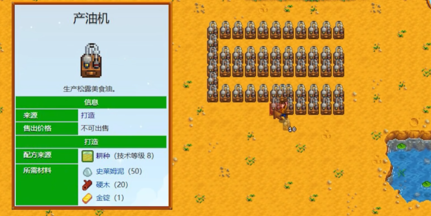 松露油任务是镇长在第二年夏季第21天通过信件委托的重要任务。玩家需要将松露放入产油机加工6小时获得松露油,完成后交付给镇长可获得500金奖励。松露可通过养猪获得,产油机需要史莱姆、硬木和金锭制作。该任务没有时间限制,但建议尽早完成以避免遗忘。