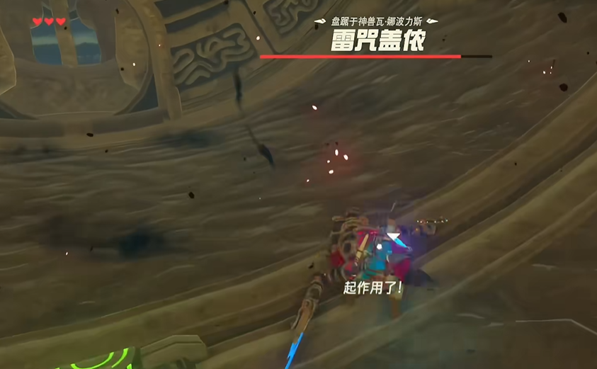 最终要与雷咒盖侬进行首领战,这场战斗分为三个阶段,对操作有一定要求。第一阶段,盖侬会使用快速的Z字型瞬移和近战突进攻击。应对方法是看准其攻击瞬间进行后空翻以触发林克时间并进行反击,若不擅长闪避,持盾稳健防御后再攻击也是可行策略。重点在于攻击并打碎它的盾牌,这会使它陷入硬直状态,是输出的关键时机。当首领血量降至一半以下时,战斗进入第二阶段。此时雷咒盖侬会飞到场地中央,向地面插入多根铁柱并召唤雷电。应对此阶段的关键是使用磁力抓取器吸起一根铁柱,并将其举到盖侬身边,这样它召唤的雷电就会劈中自己,使其坠落并进入可攻击的硬直状态。